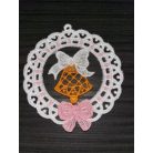 Csipke dísz keretben, felakasztható, karácsonyfa dísznek is kiválóan alkalmas. 9-10 cm magasak. Bármilyen színben kérhető.
